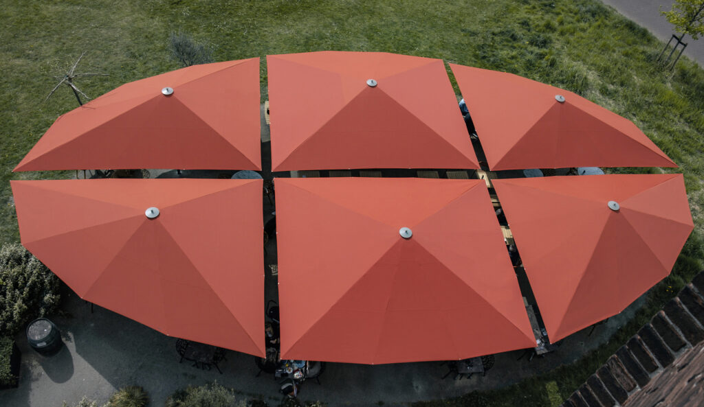 Da eine Standardlösung für die ungewöhnlich geformte Terrassenfläche nicht gewünscht war, entschied sich der Gastronom nach einer umfassenden Recherche im Internet und ausführlicher Beratung durch den Sonnenschutz-Fachhändler Jumboparasols für eine Sonnen- und Wetterschutzlösung von Caravita. Zum Einsatz kommen dabei sechs individuell gefertigte Großschirme vom Typ Big Ben Freestyle – eine Lösung, die sowohl funktional als auch ästhetisch überzeugt. Vier der Schirme mit asymmetrischem Zuschnitt und einer Seitenlänge von bis zu 6,55 Metern wurden passgenau an den Seitenbereichen der Terrasse installiert, zwei weitere mit einer Seitenlänge von 5,28 Metern decken die zentrale Fläche ab – so ist der gesamte ovale Platz optimal verschattet.