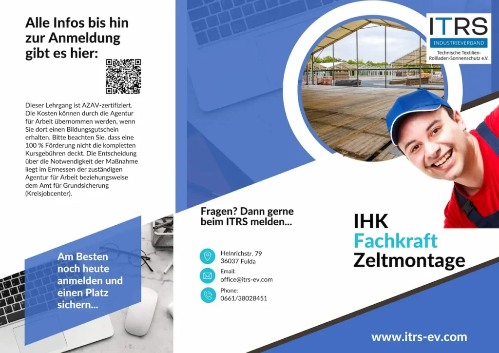 Im Rahmen der Kooperation zwischen dem ITRS (Industrieverband Technische Textilien-Rollladen-Sonnenschutz e.V.) und dem BBZ Mitte GmbH, wurde der bundesweit einmalige IHK Zertifikatslehrgang „IHK Fachkraft Zeltmontage“ konzeptioniert, um aktiv frisch qualifizierte Mitarbeiter zu gewinnen